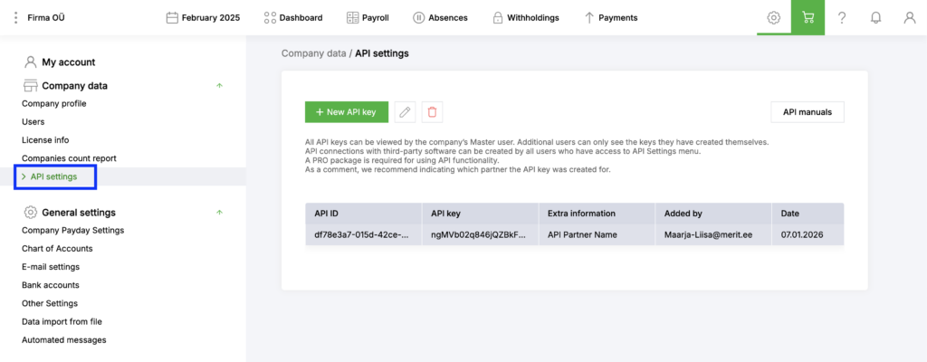 Admin users can generate and manage API credentials in Merit Palk Settings > API Settings.